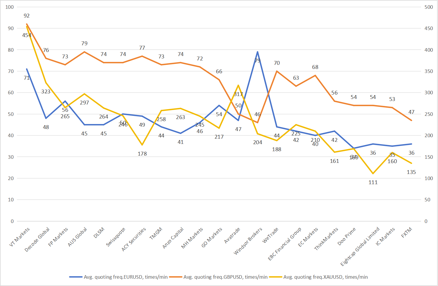 Các nhà môi giới có tần suất thấp hơn như Eightcap (111 lần/phút) và FXTM (135 lần/phút) phản ánh khả năng phản ứng chậm hơn với giá.