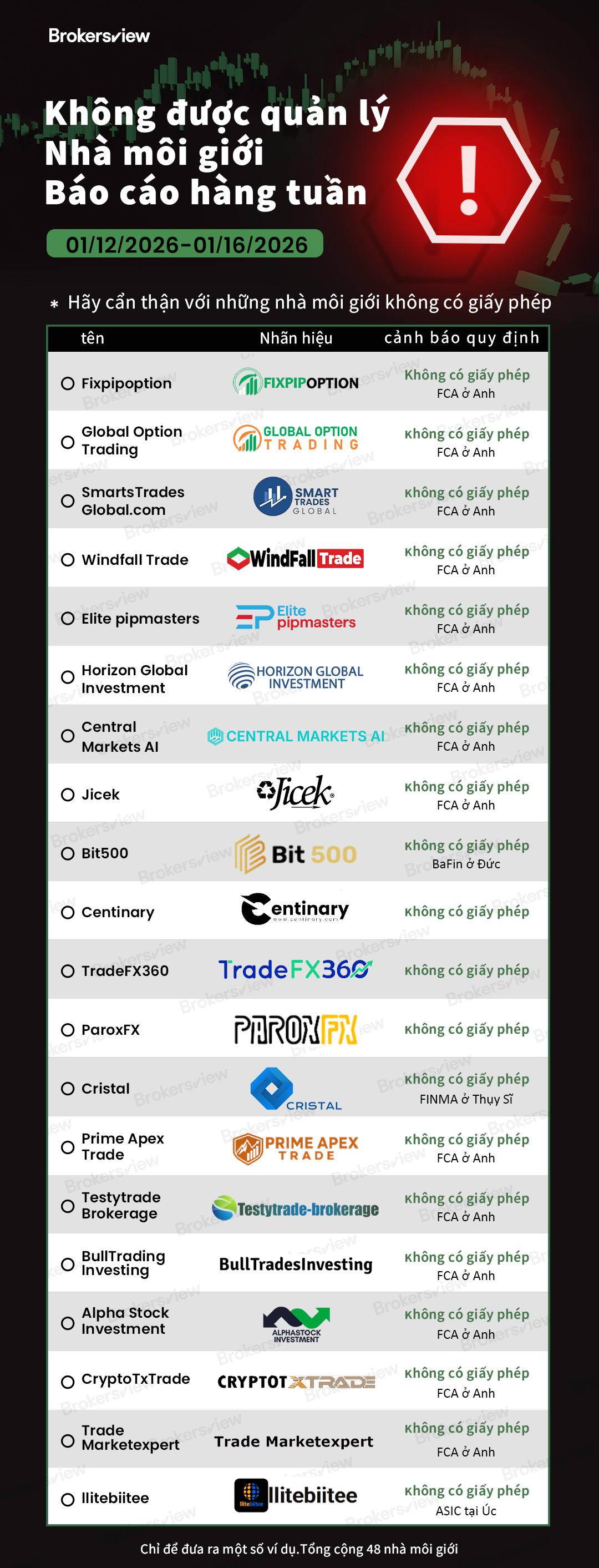 BrokersView đã vạch trần các nhà môi giới lừa đảo từ ngày 12 tháng 1 năm 2026 đến ngày 16 tháng 1 năm 2026 :