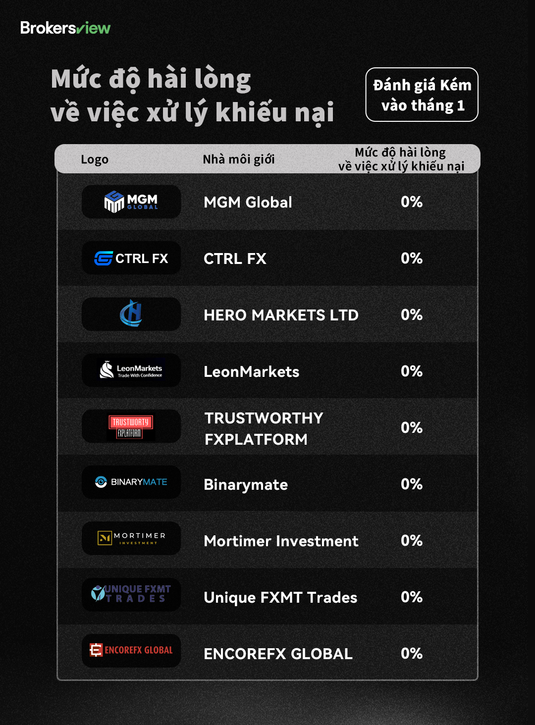 Hầu hết các nhà đầu tư, đặc biệt là những người mới bắt đầu, có xu hướng bỏ qua thái độ phục vụ của nhà môi giới khi lựa chọn nền tảng giao dịch. Tuy nhiên, thái độ đối với khách hàng sẽ ảnh hưởng đáng kể đến trải nghiệm giao dịch. Do đó, để hỗ trợ các nhà đầu tư đưa ra quyết định sáng suốt, BrokersView cập nhật hàng tháng danh sách các nhà môi giới và xếp hạng họ theo mức độ hài lòng về khiếu nại. Chúng tôi mong muốn cung cấp cái nhìn sâu sắc hữu ích về cách họ đánh giá ý kiến của khách hàng và mức độ dịch vụ khách hàng tổng thể mà họ cung cấp.