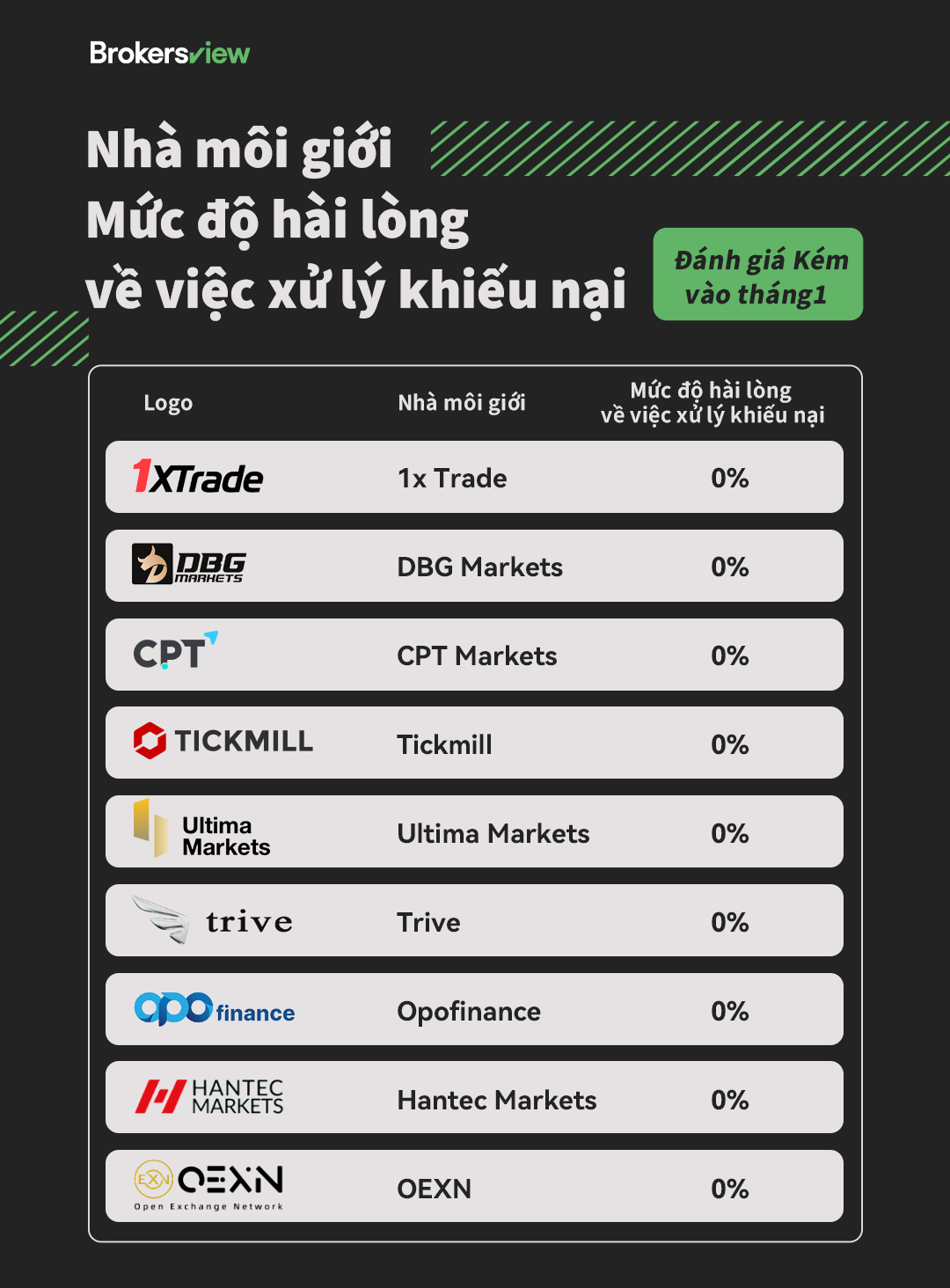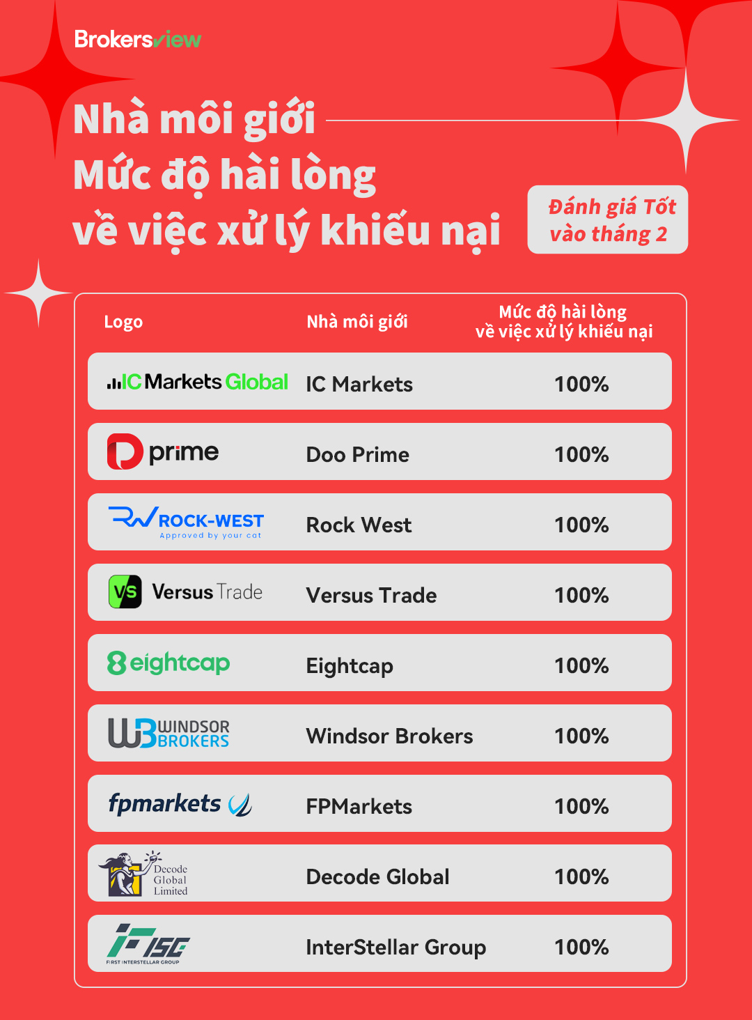 Hầu hết các nhà đầu tư, đặc biệt là người mới bắt đầu, thường bỏ qua thái độ phục vụ của các nhà môi giới khi lựa chọn nền tảng giao dịch. Tuy nhiên, cách một nhà môi giới đối xử với khách hàng có thể ảnh hưởng đáng kể đến trải nghiệm giao dịch tổng thể. Do đó, để giúp các nhà đầu tư đưa ra quyết định sáng suốt, BrokersView cập nhật danh sách các nhà môi giới hàng tháng và xếp hạng họ dựa trên mức độ hài lòng về việc xử lý khiếu nại. Mục tiêu của chúng tôi là cung cấp lời khuyên tham khảo hữu ích về việc các nhà môi giới có coi trọng ý kiến khách hàng hay không và mức độ dịch vụ khách hàng tổng thể mà họ cung cấp.