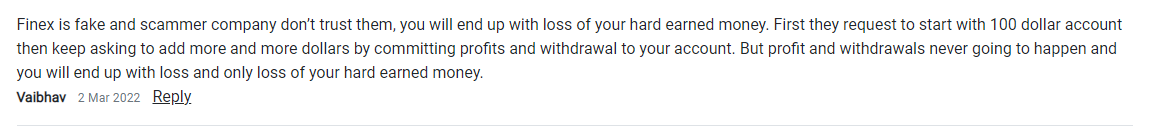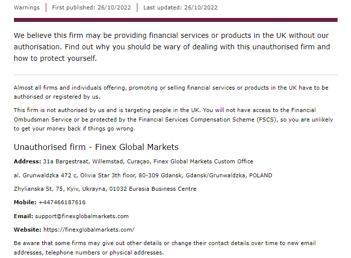 Finex Global Markets là một thực thể lừa đảo đã được xác nhận. Công ty giả vờ là một mối quan tâm chính đáng để đánh lừa các nhà đầu tư. Khi công ty bị cáo buộc có sai sót trong quá trình thực hiện giao dịch và xử lý rút tiền, công ty cũng đã nhận được cảnh báo từ cơ quan quản lý ngoại hối - FCA. Do đó, chúng tôi khuyên bạn không nên tin tưởng công ty này bằng số tiền khó kiếm được của mình. Nếu bạn muốn hỏi điều gì đó, vui lòng liên hệ với Sevice@BrokersView.com.