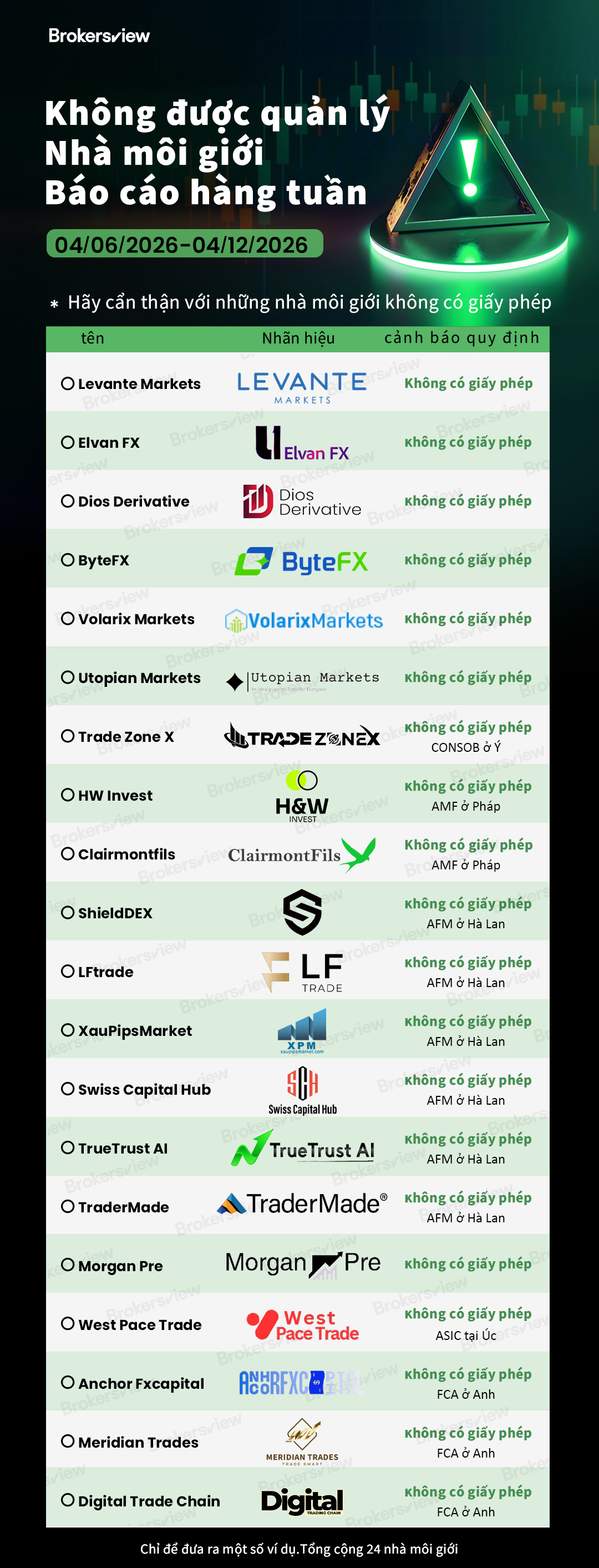 Trong giai đoạn từ ngày 6 đến ngày 12 tháng 4 năm 2026, 13 công ty môi giới đã nhận được cảnh báo chính thức từ các cơ quan quản lý, bao gồm CONSOB của Ý, AMF của Pháp, AFM của Hà Lan, ASIC của Úc và FCA của Anh. 11 công ty môi giới không được quản lý đã được xác định. Giao dịch với các tổ chức này không mang lại sự bảo vệ nào cho nhà đầu tư.
