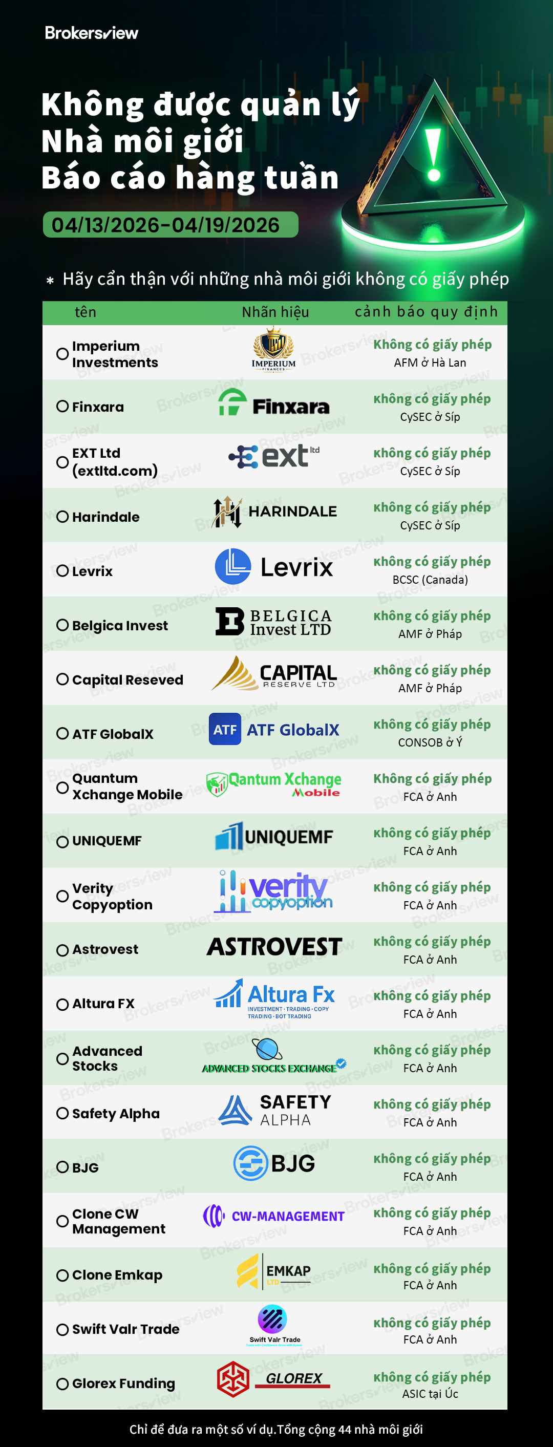 Trong tuần từ ngày 13 đến 19 tháng 4, Brokersview đã xác định được tổng cộng 44 nhà môi giới không được quản lý hoặc bị cơ quan quản lý cảnh báo.