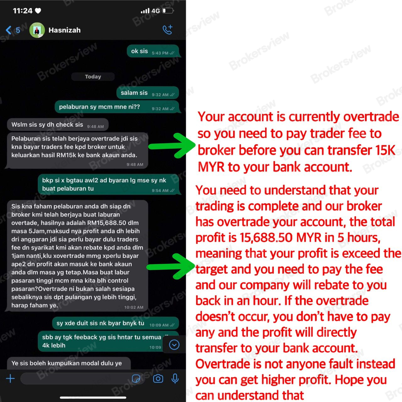 Mặc dù cô không đích thân mở tài khoản hoặc tham gia giao dịch, khoảng 5 giờ sau, nhà đầu tư được thông báo rằng các giao dịch của cô đã "kiếm được" 15.688,5 RM, trong khi cô cũng phải trả thêm một khoản phí do "giao dịch quá mức".