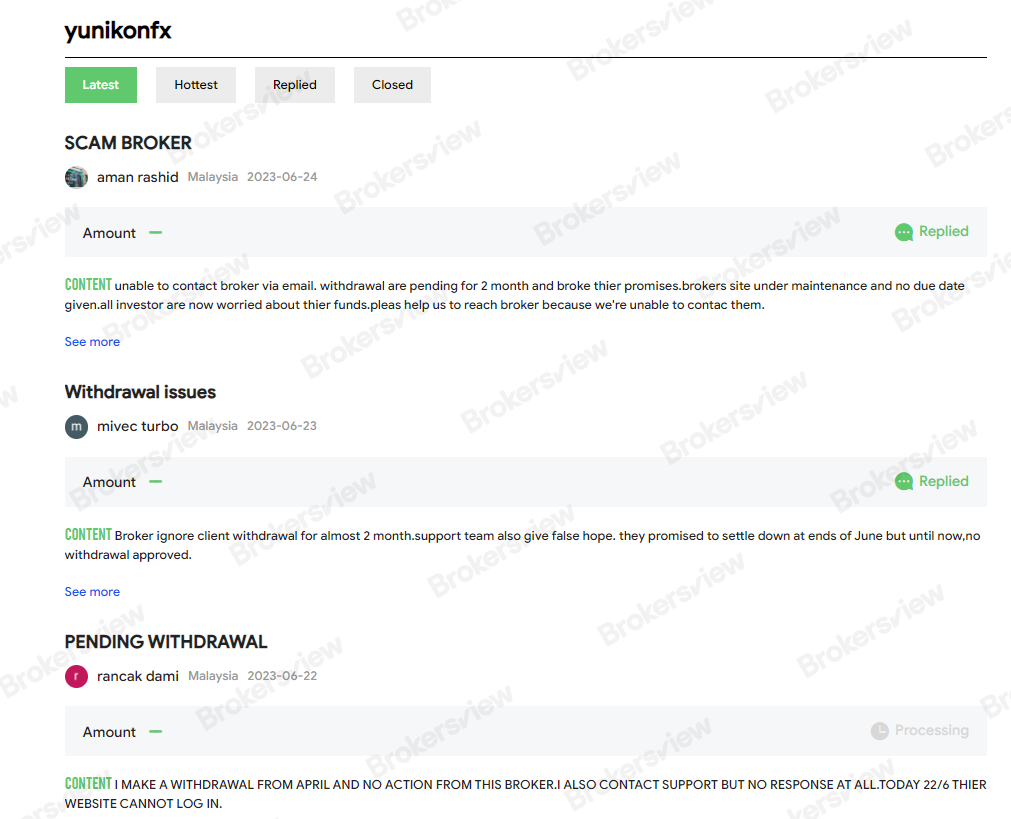Khách hàng của YunikonFX phát hiện ra rằng các yêu cầu rút tiền của họ vẫn đang chờ xử lý mà không có lý do kể từ tháng 4 năm nay mà không có bất kỳ tuyên bố chính thức nào từ nền tảng giao dịch giải thích tình hình. Mặc dù đã cố gắng liên hệ với nhóm hỗ trợ khách hàng của nhà môi giới, người dùng đã không nhận được bất kỳ phản hồi nào. Do đó, nỗi sợ mất số tiền khó kiếm được bao trùm lên người dùng của YunikonFX.