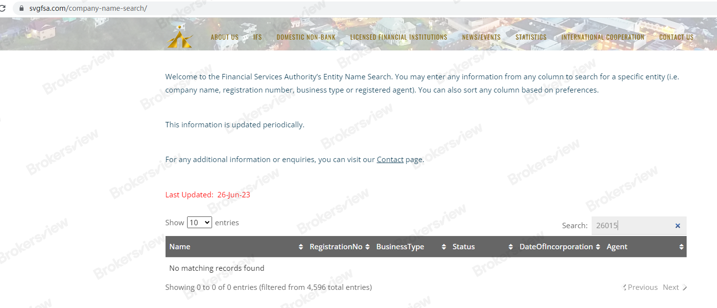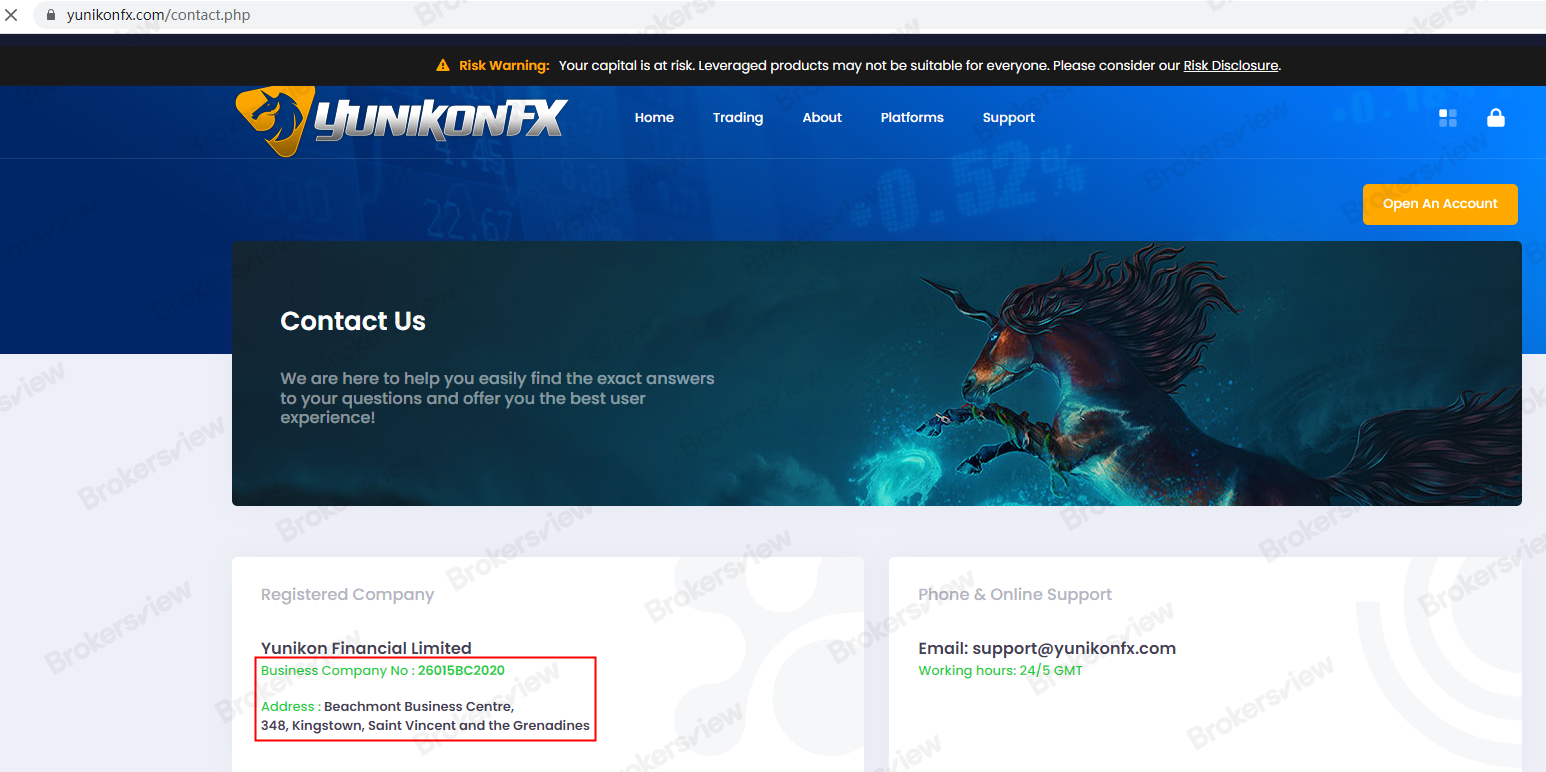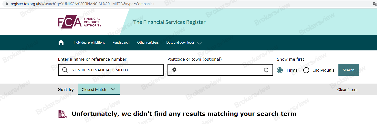 Trên trang "Liên hệ", YunikonFX cung cấp số đăng ký, 26015BC2020, được cho là do Cơ quan Dịch vụ Tài chính St. Vincent và Grenadines (SVG FSA) cấp. Tuy nhiên, hóa ra đó là thông tin giả mạo, vì không có mục nào phù hợp với nó có thể được tìm thấy trong sổ đăng ký SVG FSA. Hơn nữa, cơ quan quản lý tài chính nước ngoài này đã tuyên bố rõ ràng rằng họ không cấp giấy phép giao dịch hoặc môi giới ngoại hối, cũng như không điều chỉnh các thực thể liên quan đến các hoạt động đó.