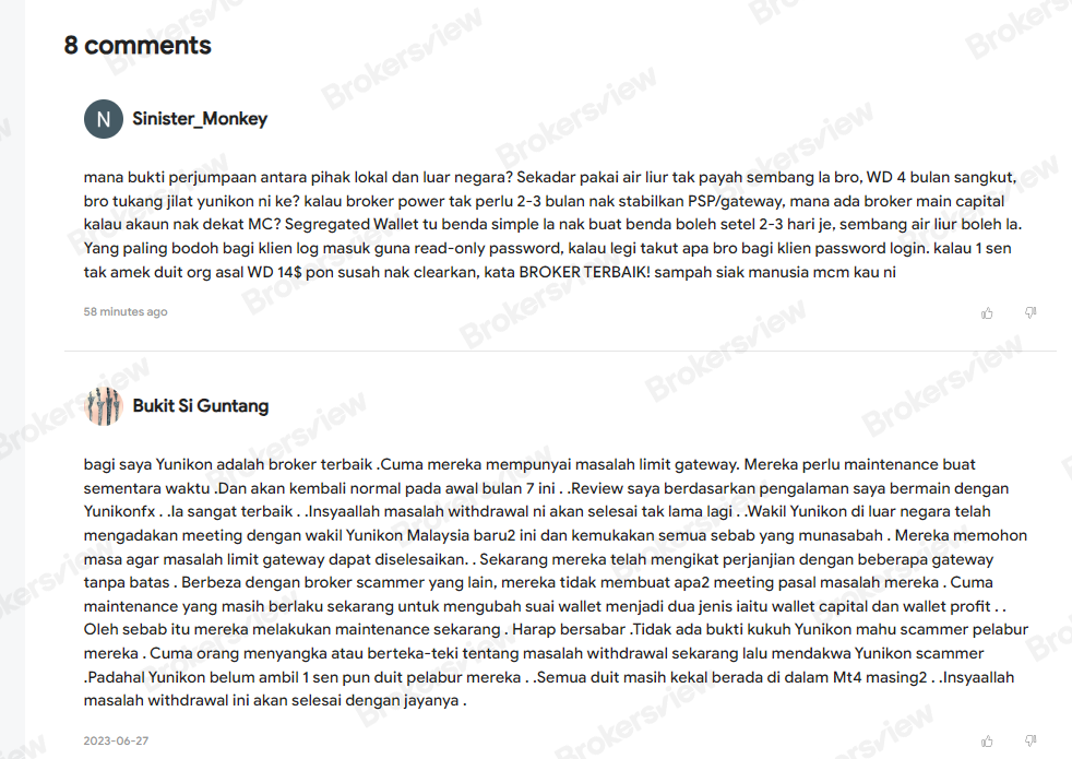 Rất nhiều nhà đầu tư đã đến nền tảng của chúng tôi để nhận xét về hiệu suất kém của nhà môi giới. Tuy nhiên, phản hồi nhận được bị phân cực, cho thấy các ý kiến khác nhau về độ tin cậy của YunikonFX.