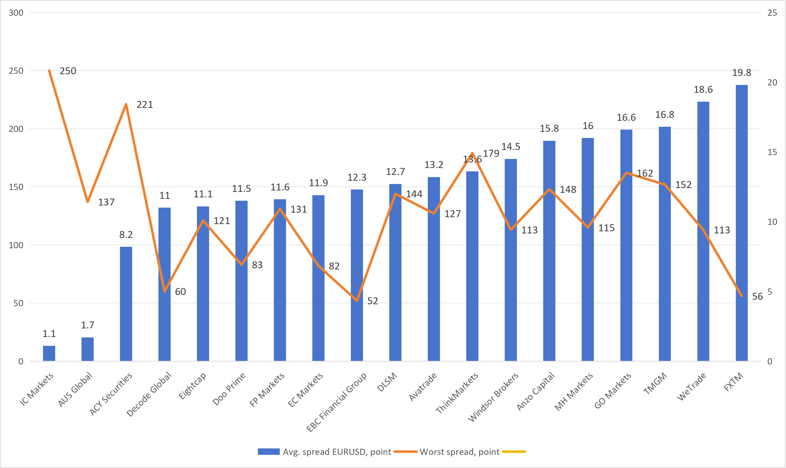 Trong so sánh chênh lệch tỷ giá EUR/USD, IC Markets ghi nhận mức giá cạnh tranh nhất.