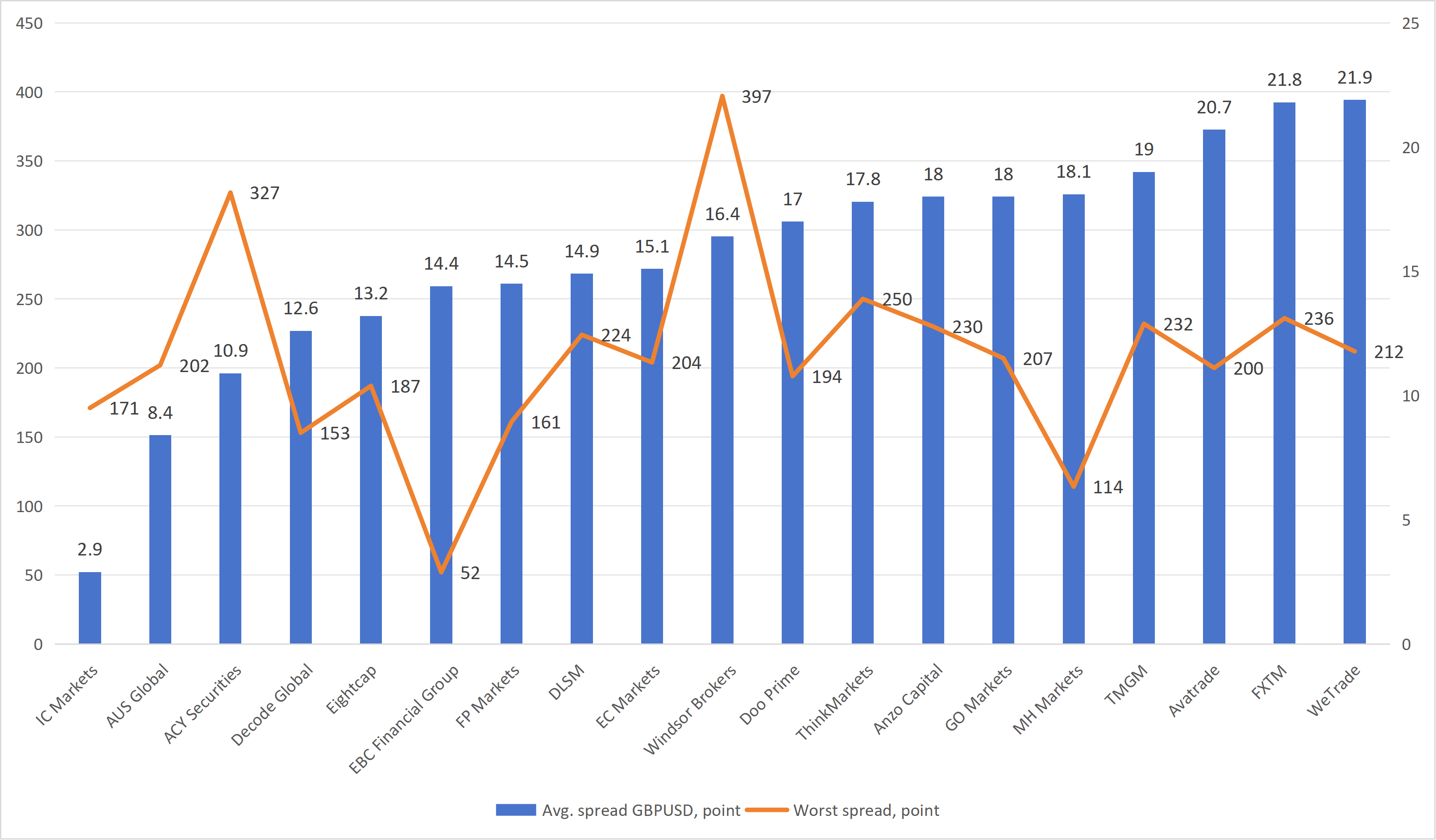 IC Markets tiếp tục dẫn đầu bảng xếp hạng với mức chênh lệch giá thấp nhất, phản ánh nguồn thanh khoản dồi dào và giá cả cạnh tranh.