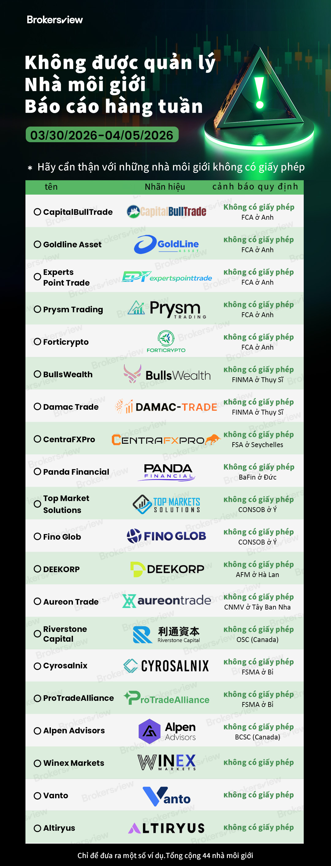 Tuần này lại thêm một đợt các nhà môi giới gian lận bị vạch trần. Từ ngày 30 tháng 3 đến ngày 5 tháng 4, Brokersview đã xác định và phơi bày 44 nhà môi giới không được quản lý, hoạt động mà không có giấy phép hợp lệ hoặc sử dụng các bản sao giả mạo của các công ty được quản lý. Các nền tảng này đã bị các cơ quan quản lý lớn như FCA (Anh), BaFin (Đức), CONSOB (Ý), FINMA (Thụy Sĩ) và các cơ quan khác cảnh báo.