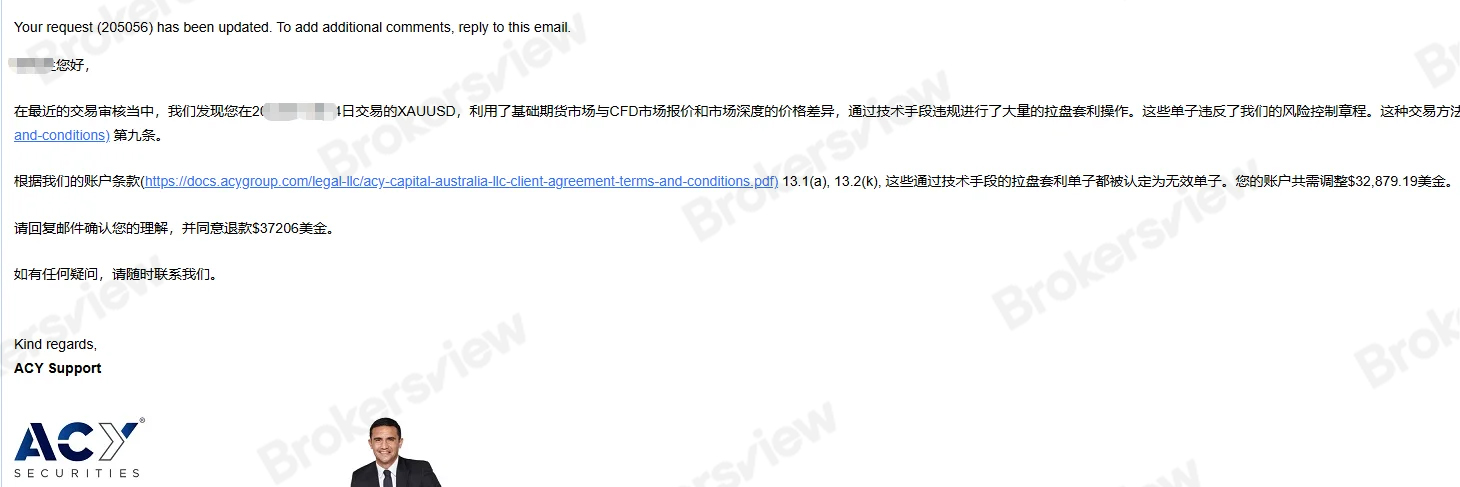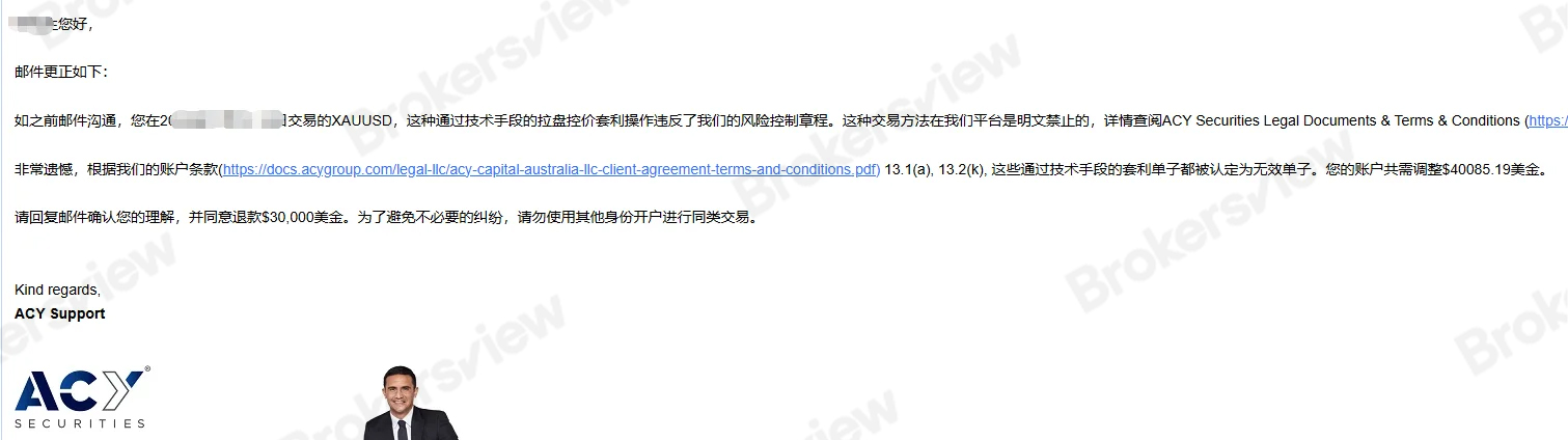 Ảnh chụp màn hình thư điện tử do nhà giao dịch cung cấp cho thấy ACY ban đầu xác định đã xảy ra vi phạm và yêu cầu khấu trừ 32.879,19 đô la từ lợi nhuận, hứa sẽ hoàn trả số tiền còn lại. Vì lo ngại cho sự an toàn của vốn gốc, nhà giao dịch cho biết mặc dù chịu áp lực tâm lý rất lớn, anh ta không còn lựa chọn nào khác ngoài việc đồng ý với đề nghị này, chỉ với hy vọng thu hồi lại số dư còn lại càng sớm càng tốt.