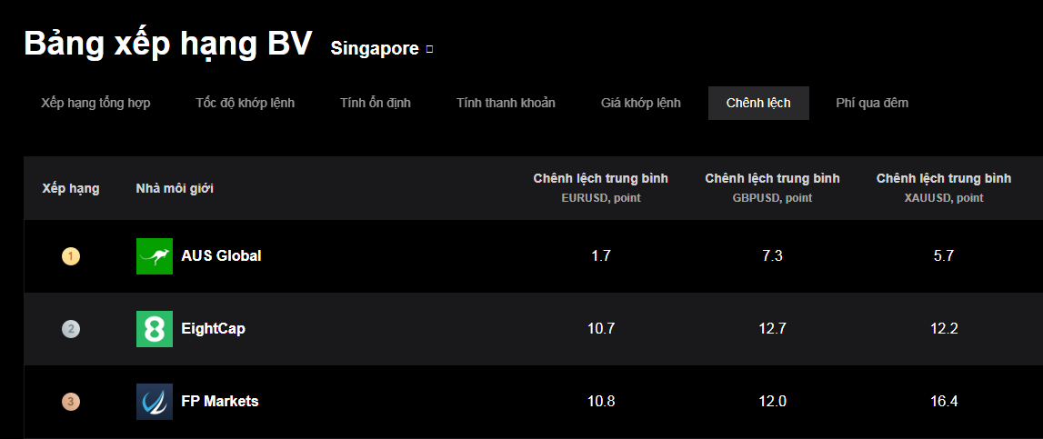 SỐ 1: AUS Global, mức chênh lệch trung bình của EURUSD, GBPUSD và XAUUSD lần lượt là 1,7, 7,3 và 5,7 điểm;