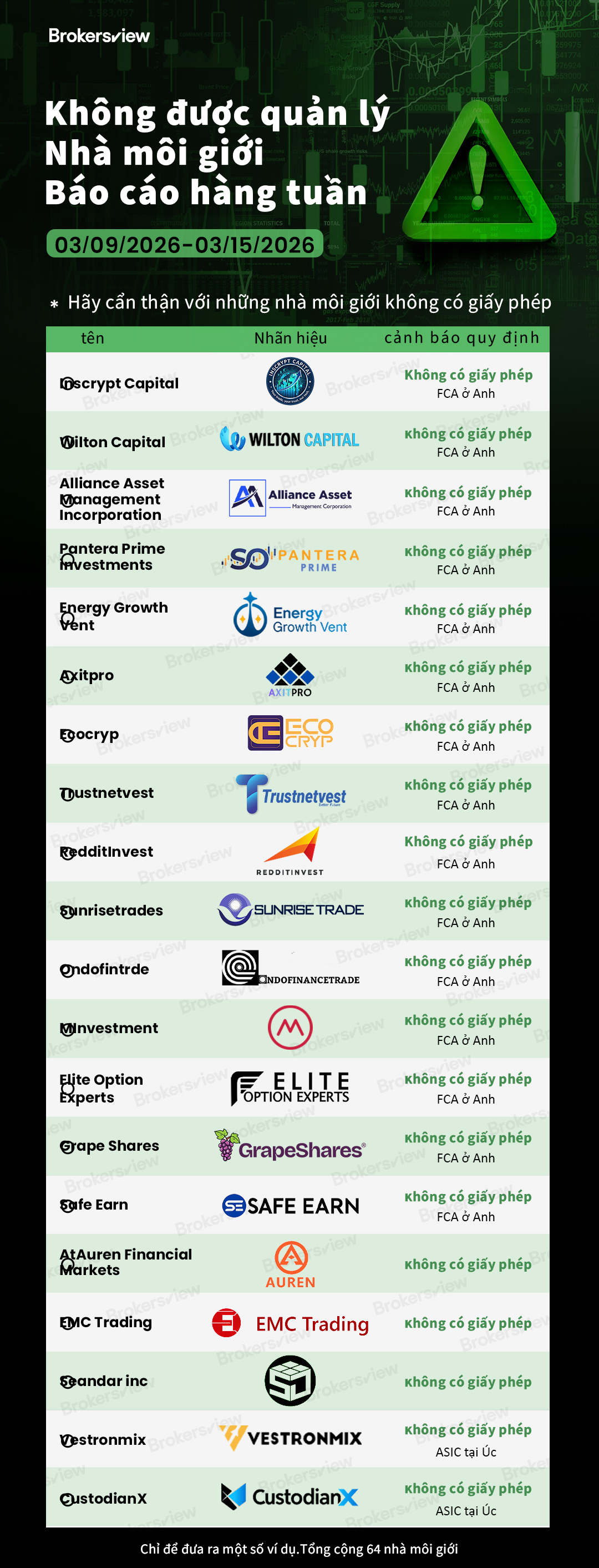 Các môi giới không có giấy phép được BrokersView báo cáo trong khoảng thời gian từ ngày 9 đến 15 tháng 3 năm 2026 :