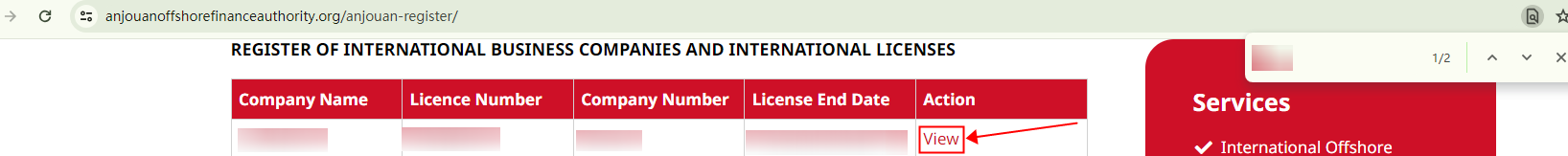 1.Truy cập trang web đăng ký thông qua liên kết: https://anjouanoffshorefinanceauthority.org/anjouan-register/, sau đó sử dụng "Ctrl+F" để tìm kiếm công ty, theo tên công ty, số giấy phép hoặc mã số công ty: