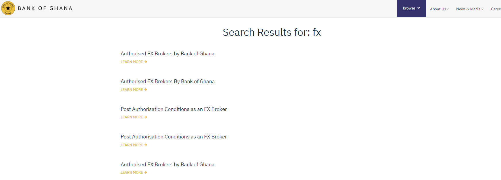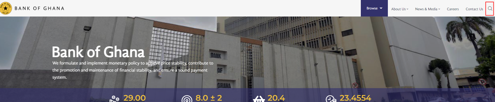 Tìm biểu tượng tìm kiếm ở góc trên bên phải của trang web https://www.bog.gov.gh/. Nhấp vào biểu tượng đó và nhập "Fx" vào thanh tìm kiếm. Bạn sẽ được chuyển hướng đến danh sách các bản phát hành có chứa từ khóa "Fx".