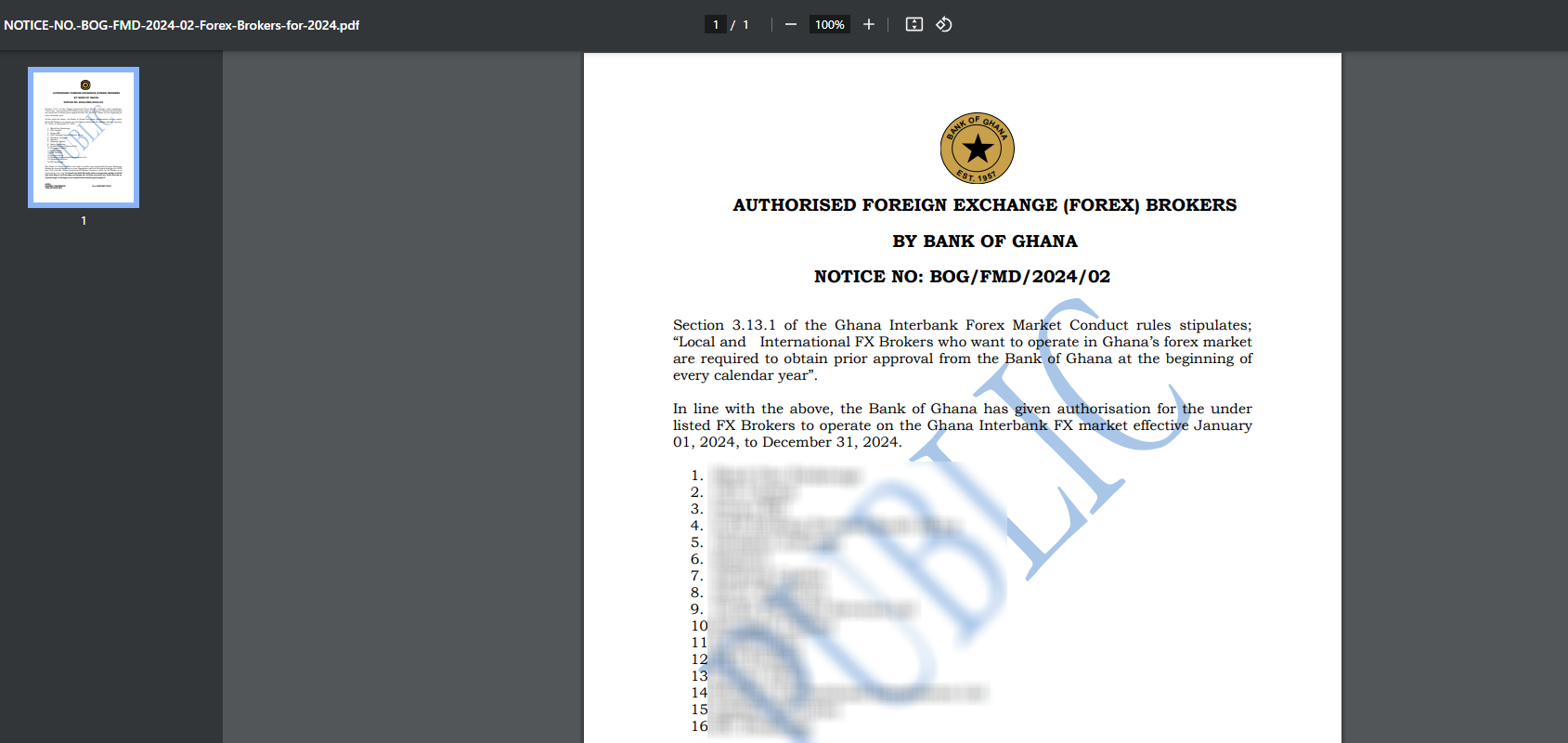 Tìm và nhấp vào bài viết có tiêu đề "Các công ty môi giới ngoại hối được Ngân hàng Ghana ủy quyền" và tải xuống tệp PDF liên quan. Tài liệu này sẽ liệt kê các công ty môi giới ngoại hối được ủy quyền trong năm. Các công ty môi giới ngoại hối phải nộp đơn xin gia hạn ủy quyền của mình vào cuối tuần làm việc đầu tiên của tháng 12 hàng năm, do đó danh sách được cập nhật hàng năm.