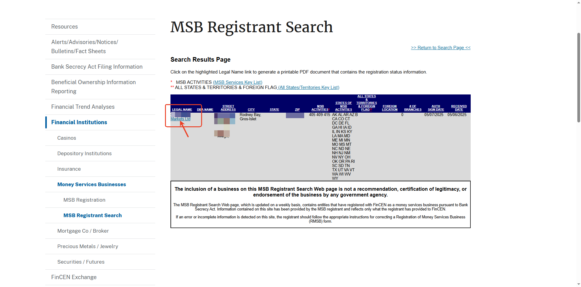 3. Sau đó, bạn sẽ thấy hồ sơ tóm tắt của nhà môi giới trên trang web của FinCEN. Nhấp vào tên nhà môi giới để tải xuống tài liệu và kiểm tra thông tin đăng ký của họ, bao gồm cả các hoạt động MSB được ủy quyền.